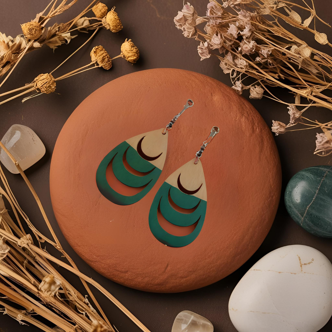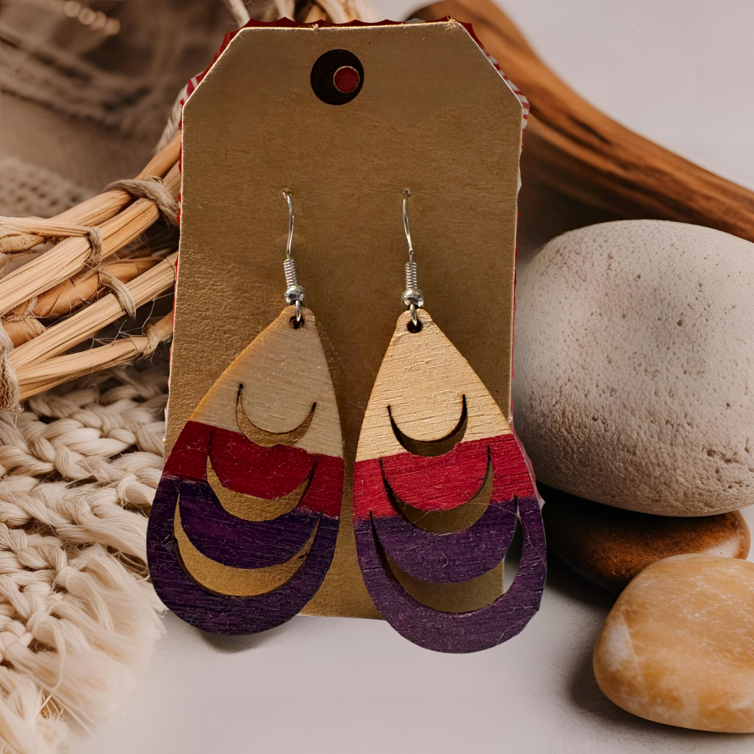 Add a bold touch to your look with these laser-cut teardrop earrings, crafted from lightweight wood for effortless, all-day wear. Featuring a unique layered crescent moon design and earthy pops of red, these funky earrings bring a playful yet grounded vibe to any outfit. Perfect for creative souls and boho lovers, these wooden earrings are both eye-catching and easy to style. Their natural wood grain and coloured accents make them a standout accessory for casual days or festival flair.